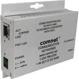 The ComNet™ CWMCFE(X)POE/M Series 2-port media converters provide full-duplex fiber optic transmission of a single channel of 10/100 Mbps Ethernet data (10/100 BASE-TX) through multimode or single mode optical fiber. Type ST, SC or SFP optical connectors are available. They provide full compliance with IEEE 802.3at as Power Sourcing Equipment(PSE), with a maximum power of 30 watts in Mode A or Mode B, making them ideal for those applications where the remote equipment draws significant power. A higher output 60 watt model is available. Mode A and mode B are selected by the media converter automatically. The Ethernet electrical interface auto-negotiates to either 10 or 100 Mbps without the need for any user selection, and the optical interface operates at 100 Mbps (100-FX). Packaged in a rugged, compact sized housing, these units are designed for shelf or stand-alone mounting, or may be DIN-rail mounted by the addition of ComNet model DINBKT2 Adaptor plate kit. LED indicators are provided for rapidly ascertaining the operating status of the device. A power supply providing 48 VDC at 1.25A is provided with each converter. Plug-and-play design ensures ease of operation, and no optical adjustments are ever required.